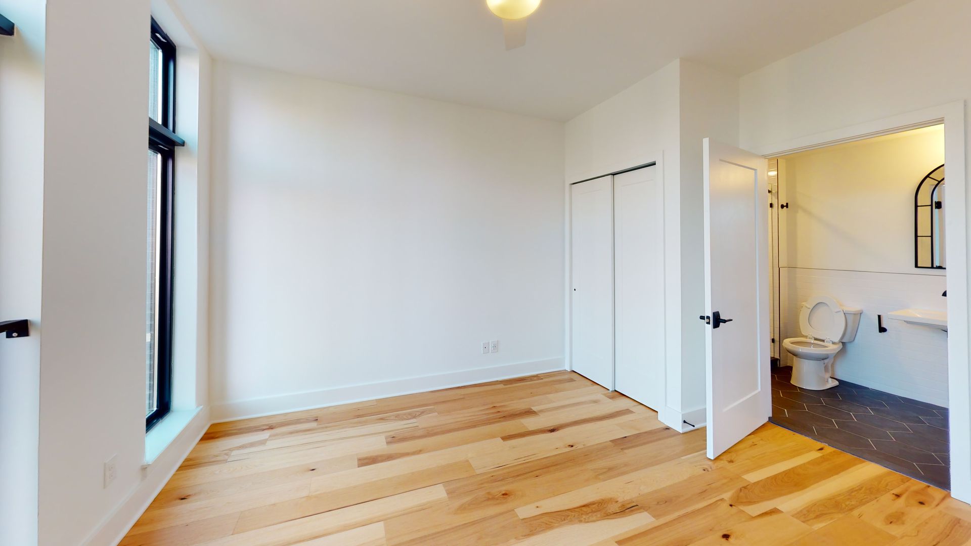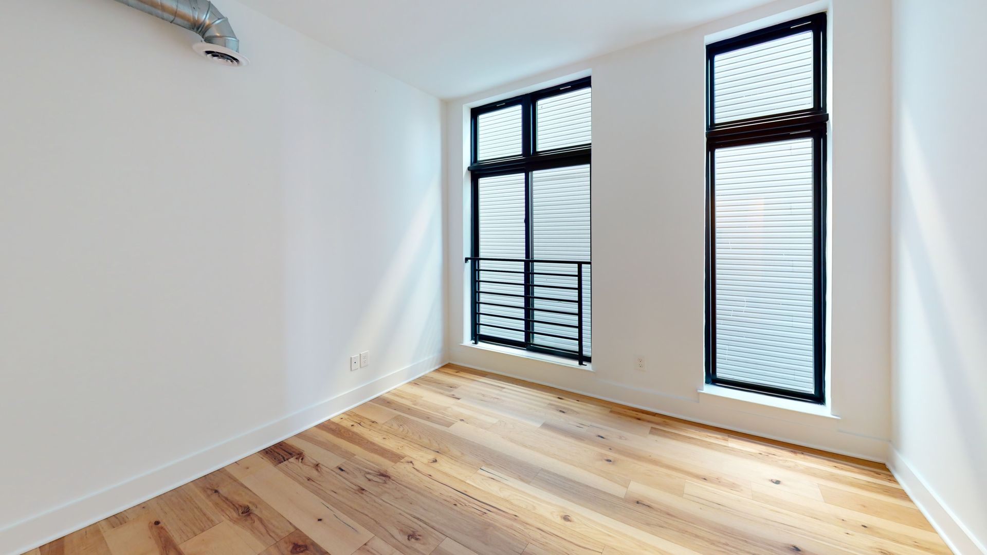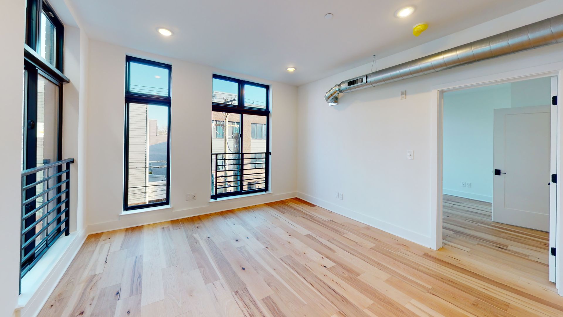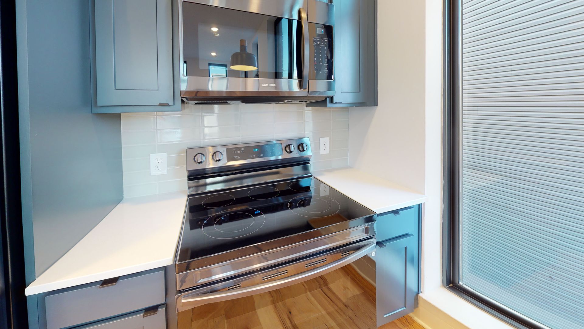 The units feature floor-to-ceiling windows that flood the space with natural light and showcase the rich hickory hardwood floors. The modern kitchens come in a range of finishes including black, navy blue, and white, with quartz countertops and fingerprint-resistant black stainless steel Samsung appliances, adding a touch of style. The in-unit stacked washer/dryers, central heating and cooling, and Energy-Star appliances make living easy and convenient.