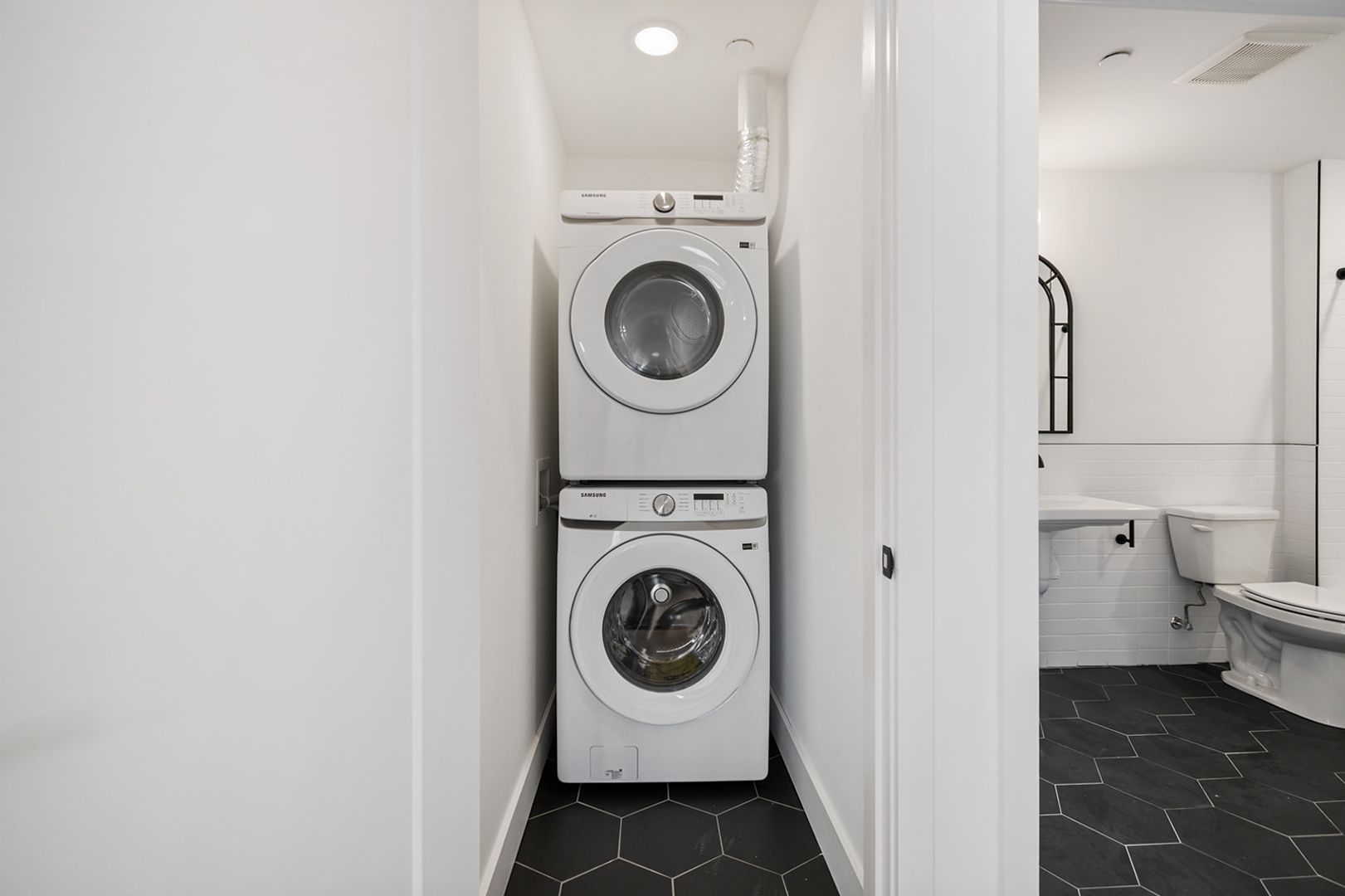 The units feature floor-to-ceiling windows that flood the space with natural light and showcase the rich hickory hardwood floors. The modern kitchens come in a range of finishes including black, navy blue, and white, with quartz countertops and fingerprint-resistant black stainless steel Samsung appliances, adding a touch of style. The in-unit stacked washer/dryers, central heating and cooling, and Energy-Star appliances make living easy and convenient.