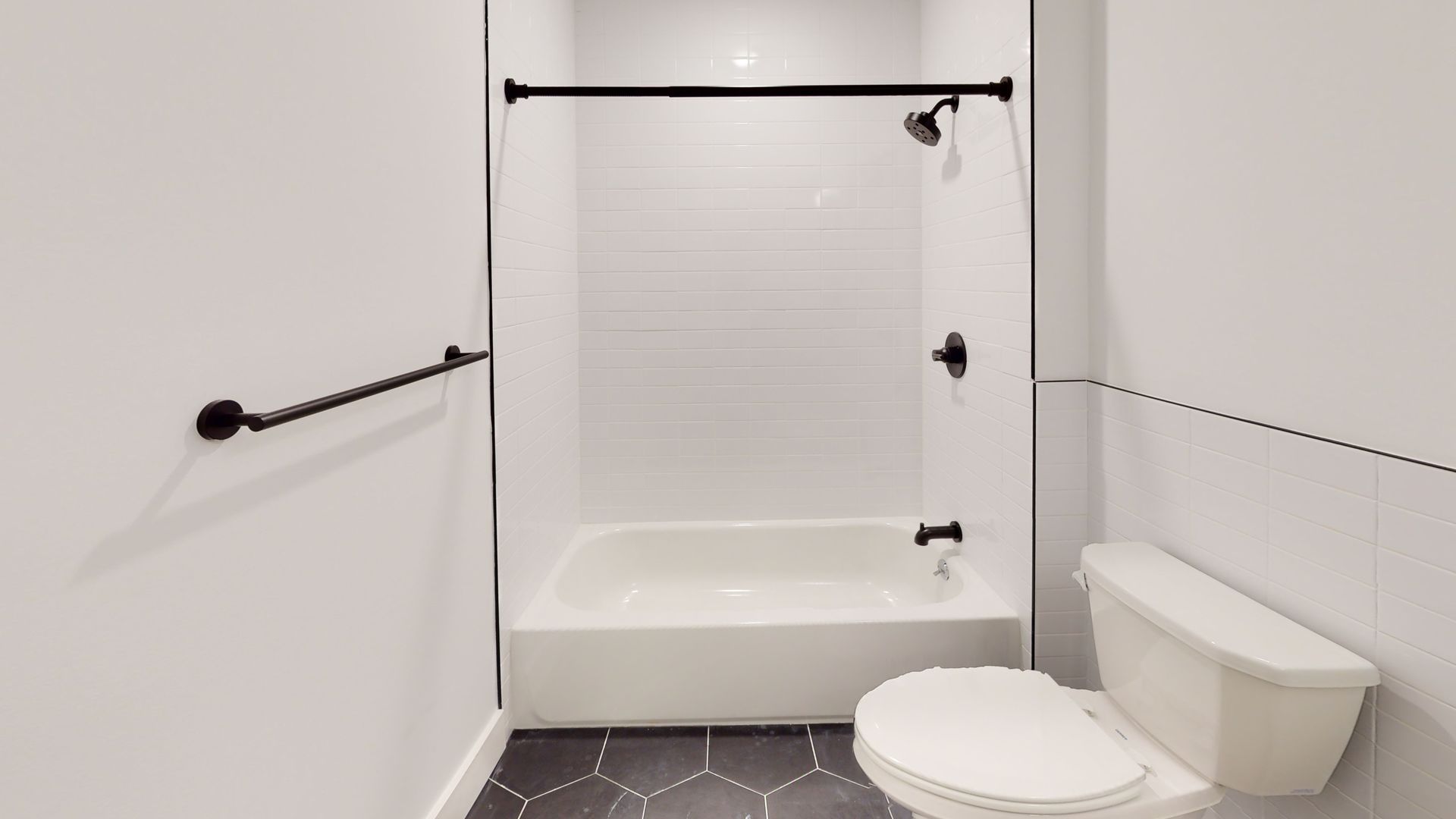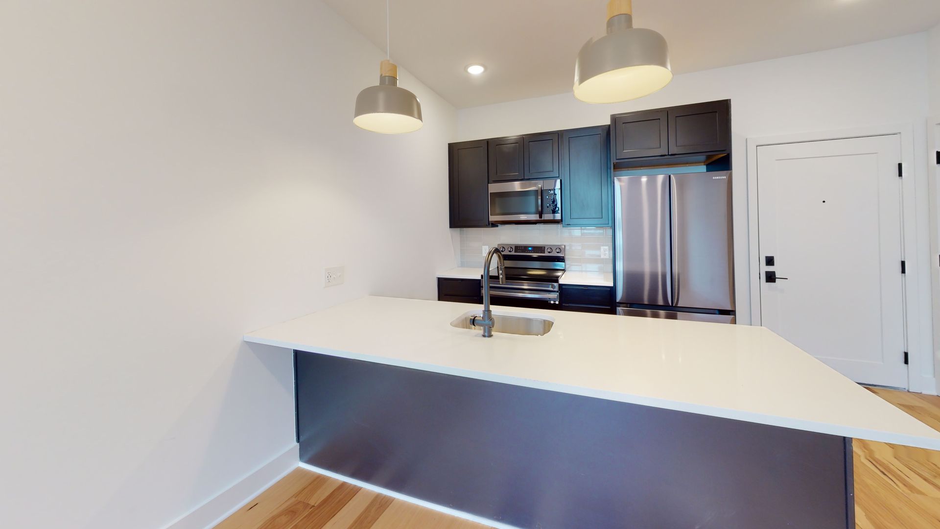 The units feature floor-to-ceiling windows that flood the space with natural light and showcase the rich hickory hardwood floors. The modern kitchens come in a range of finishes including black, navy blue, and white, with quartz countertops and fingerprint-resistant black stainless steel Samsung appliances, adding a touch of style. The in-unit stacked washer/dryers, central heating and cooling, and Energy-Star appliances make living easy and convenient.