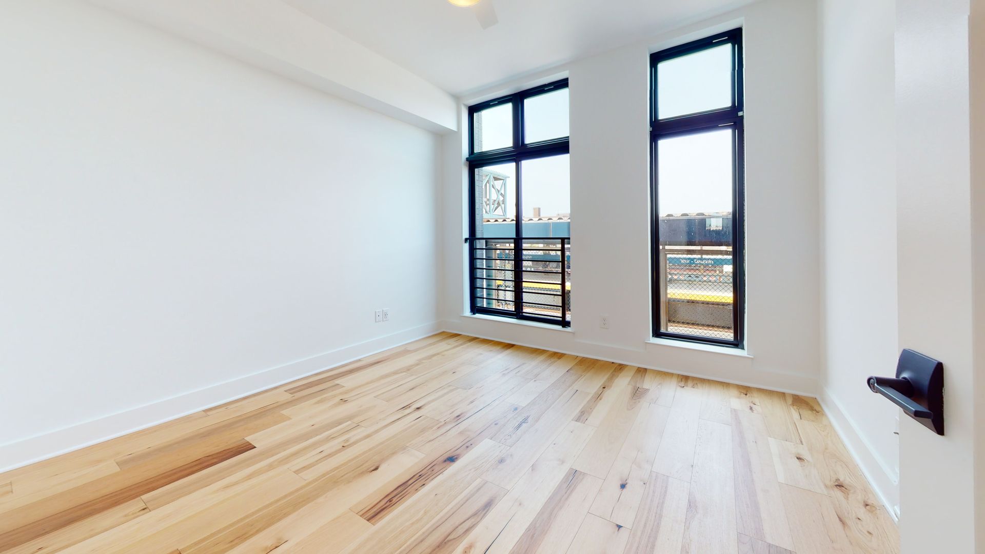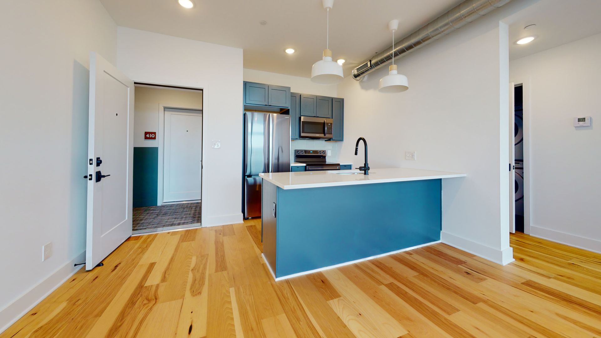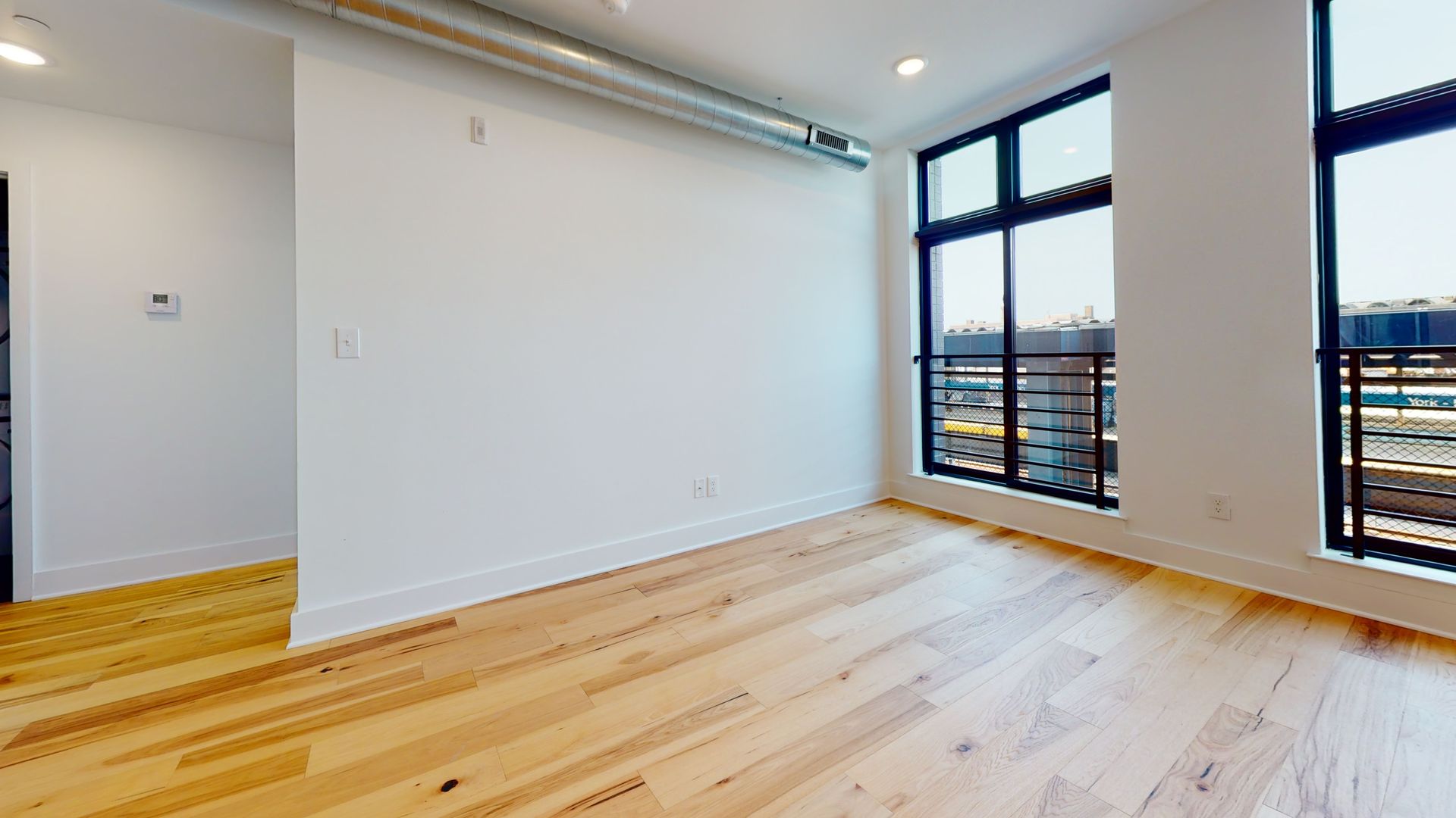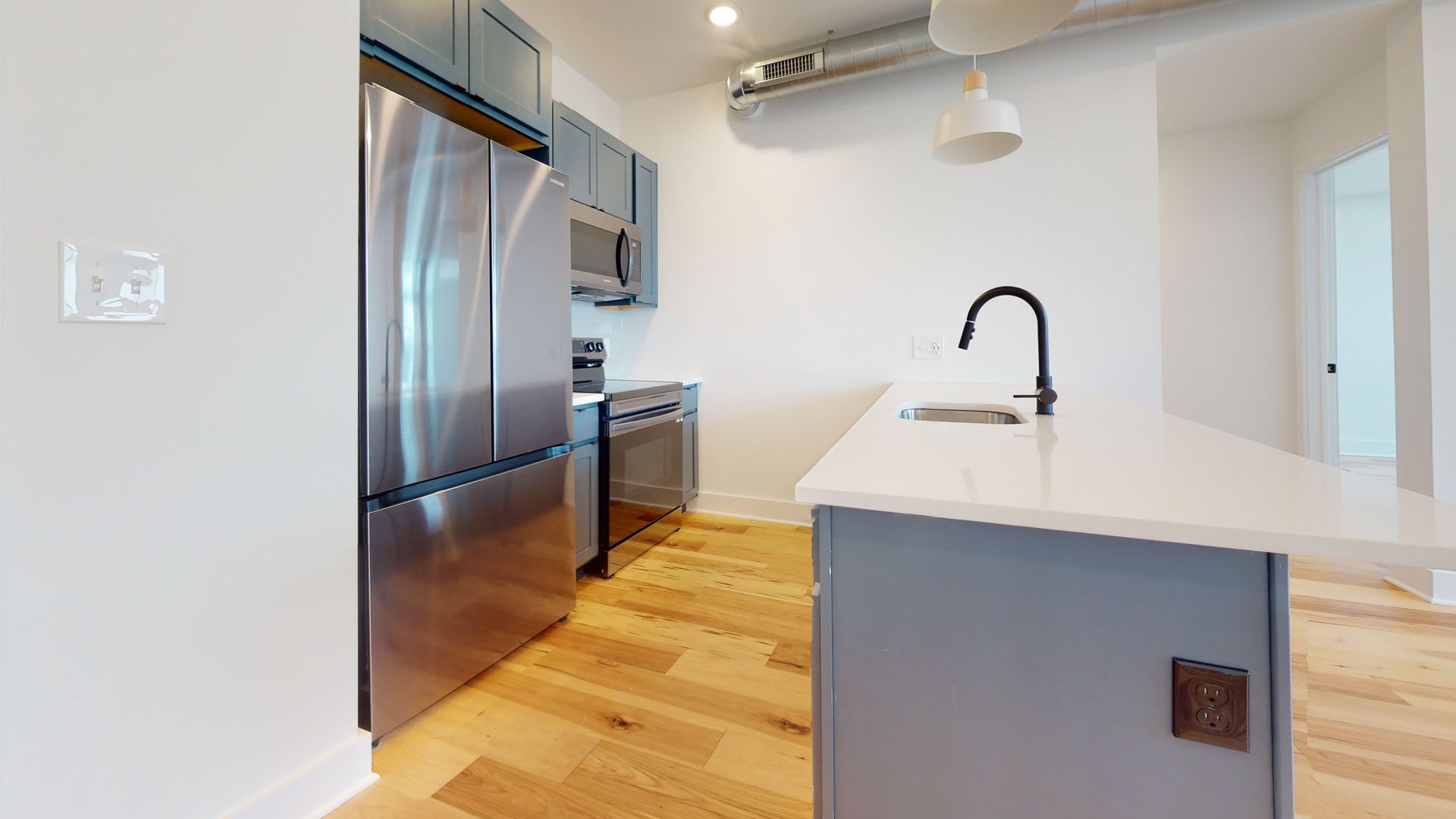 The units feature floor-to-ceiling windows that flood the space with natural light and showcase the rich hickory hardwood floors. The modern kitchens come in a range of finishes including black, navy blue, and white, with quartz countertops and fingerprint-resistant black stainless steel Samsung appliances, adding a touch of style. The in-unit stacked washer/dryers, central heating and cooling, and Energy-Star appliances make living easy and convenient.