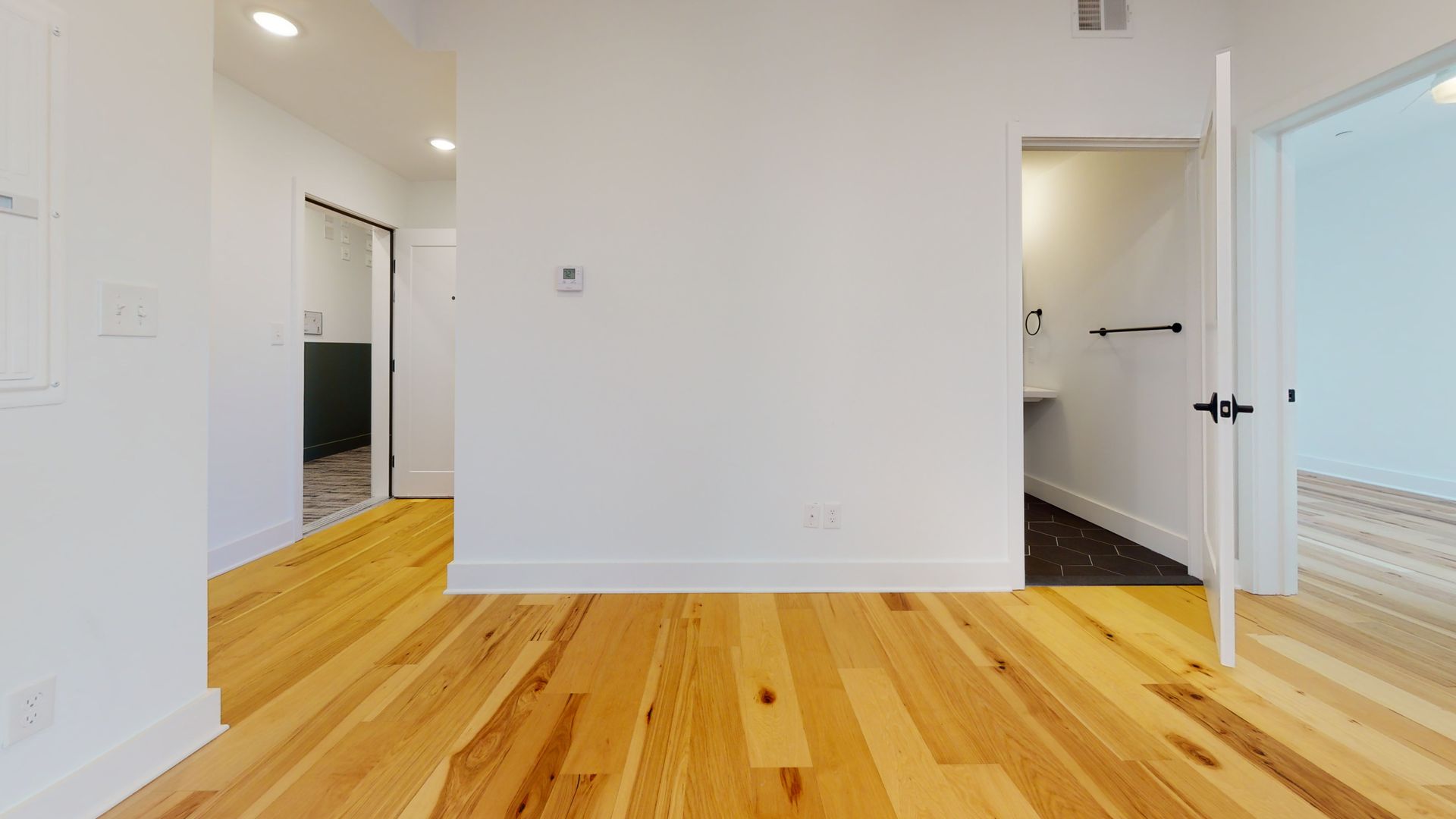 The units feature floor-to-ceiling windows that flood the space with natural light and showcase the rich hickory hardwood floors. The modern kitchens come in a range of finishes including black, navy blue, and white, with quartz countertops and fingerprint-resistant black stainless steel Samsung appliances, adding a touch of style. The in-unit stacked washer/dryers, central heating and cooling, and Energy-Star appliances make living easy and convenient.
