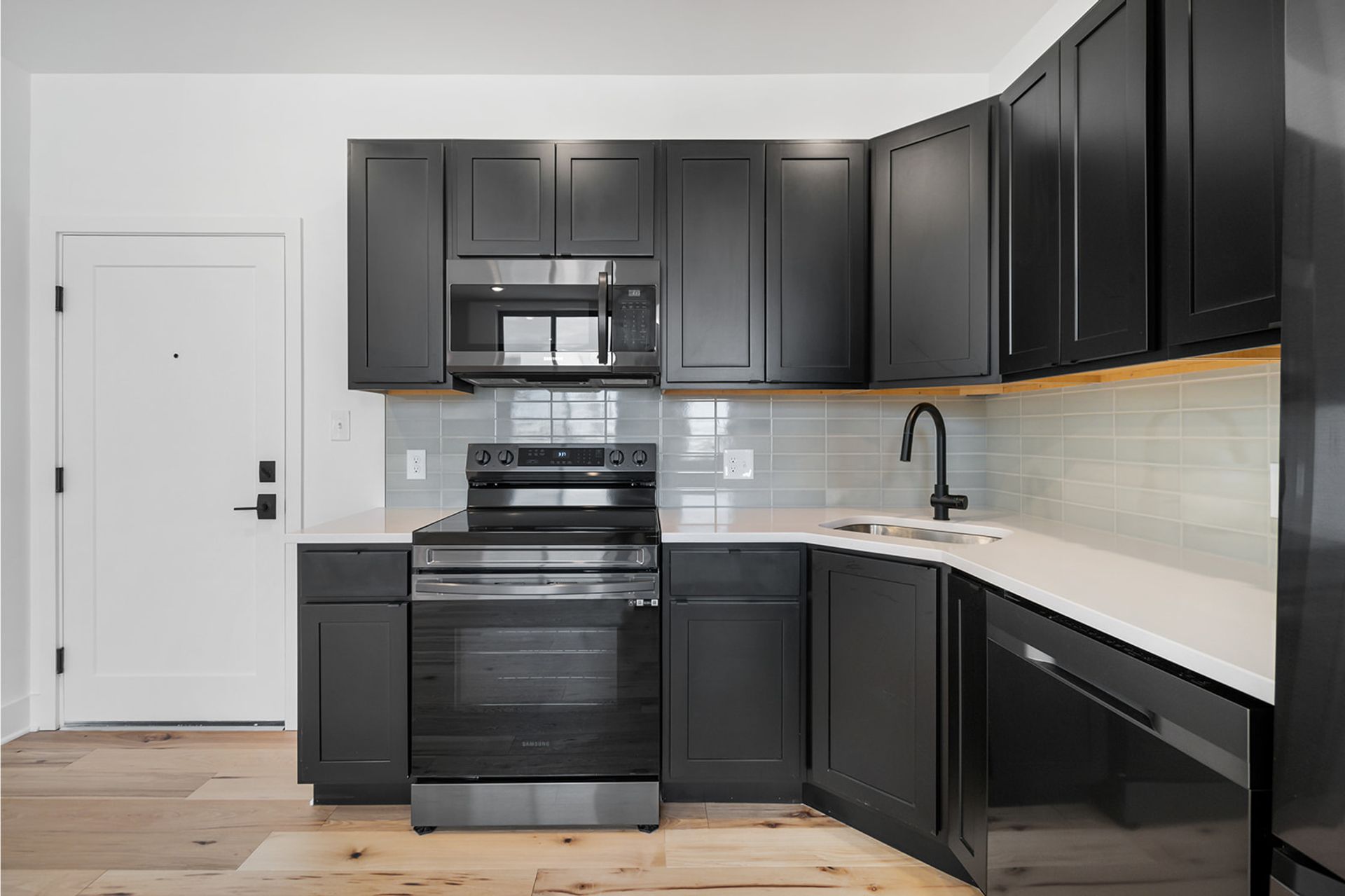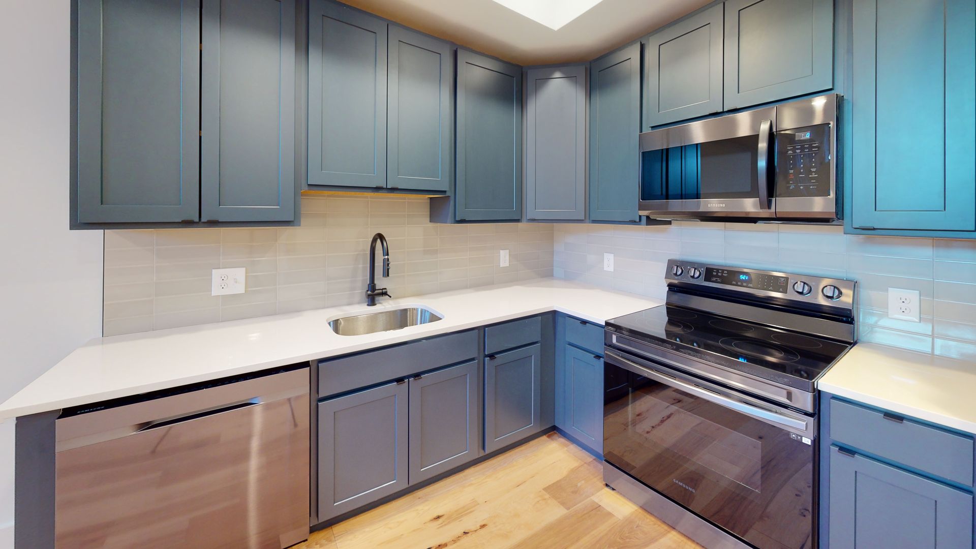 • Modern kitchens with black, navy blue, or white finishes