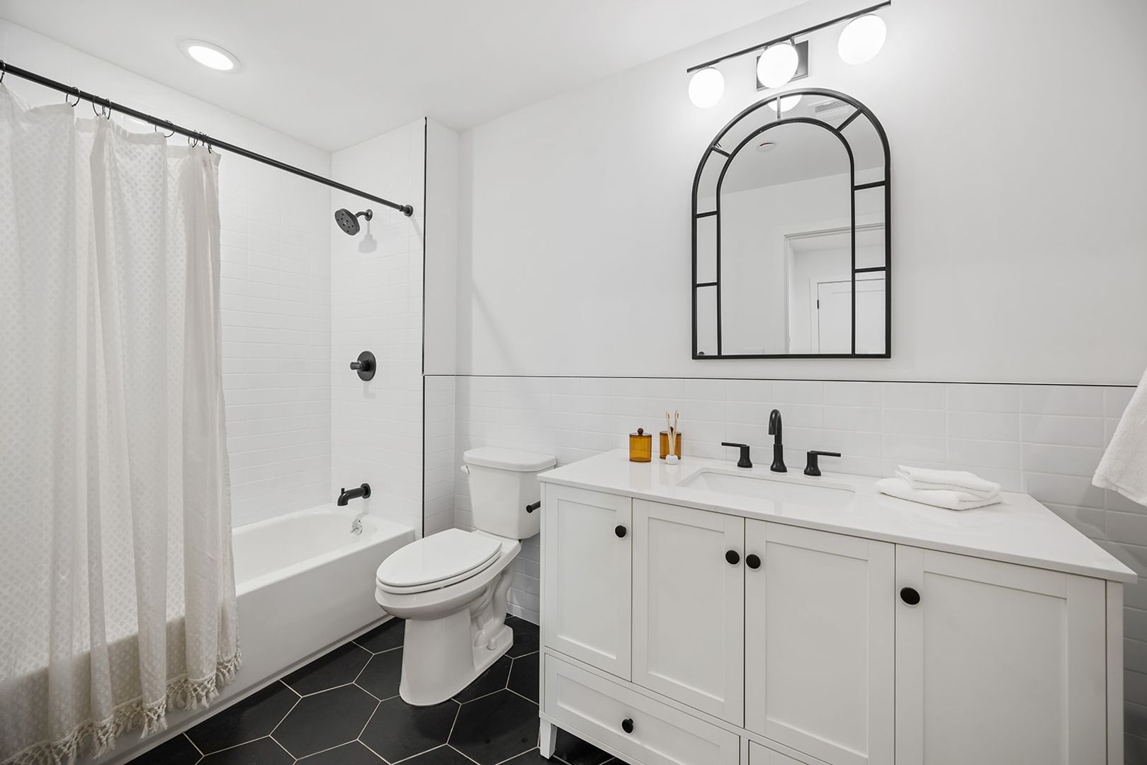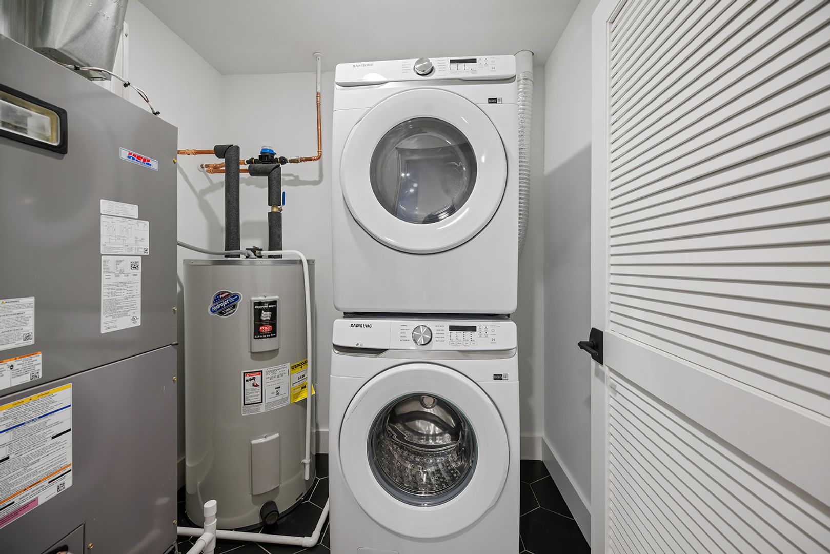 The units feature floor-to-ceiling windows that flood the space with natural light and showcase the rich hickory hardwood floors. The modern kitchens come in a range of finishes including black, navy blue, and white, with quartz countertops and fingerprint-resistant black stainless steel Samsung appliances, adding a touch of style. The in-unit stacked washer/dryers, central heating and cooling, and Energy-Star appliances make living easy and convenient.
