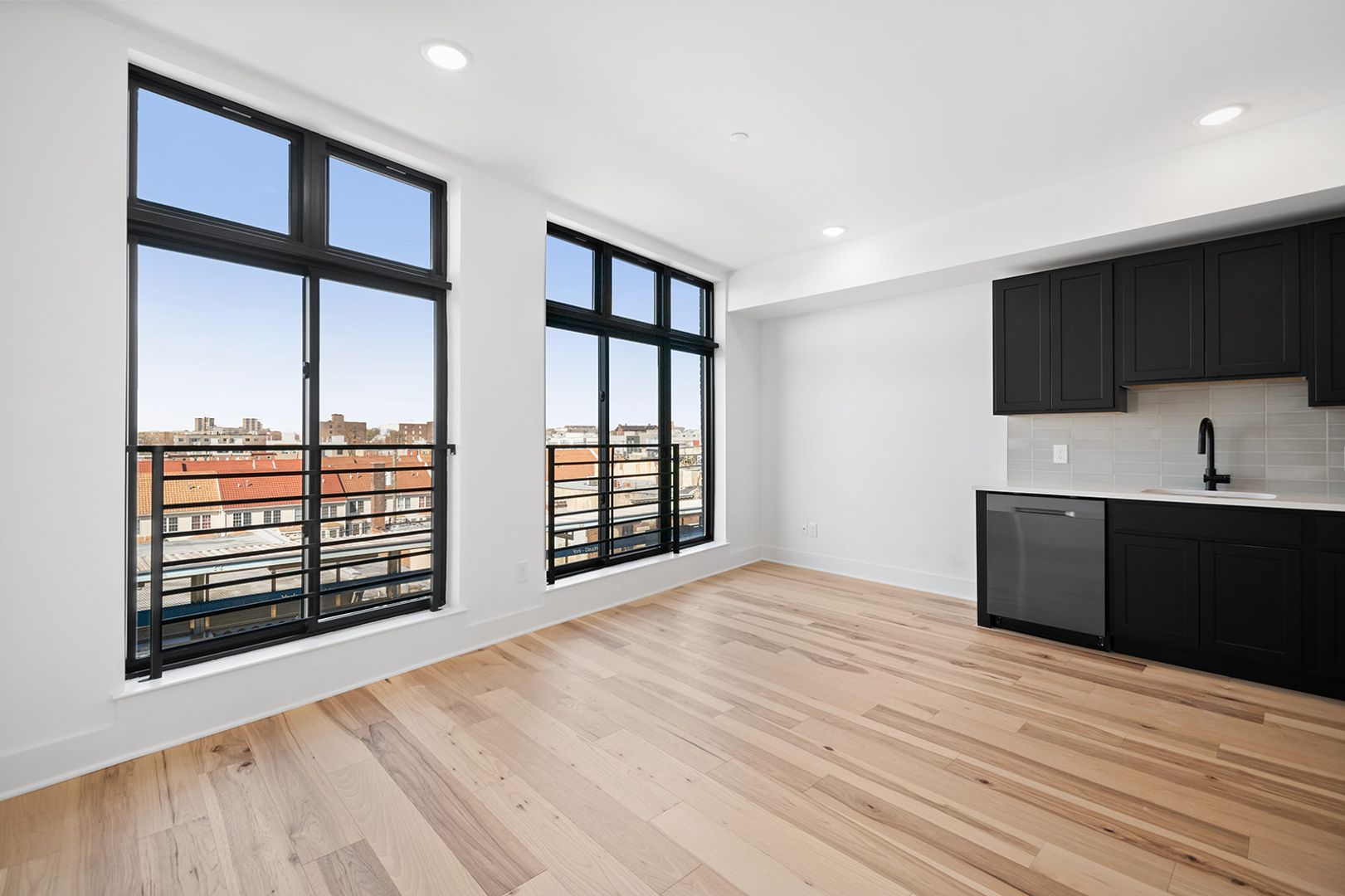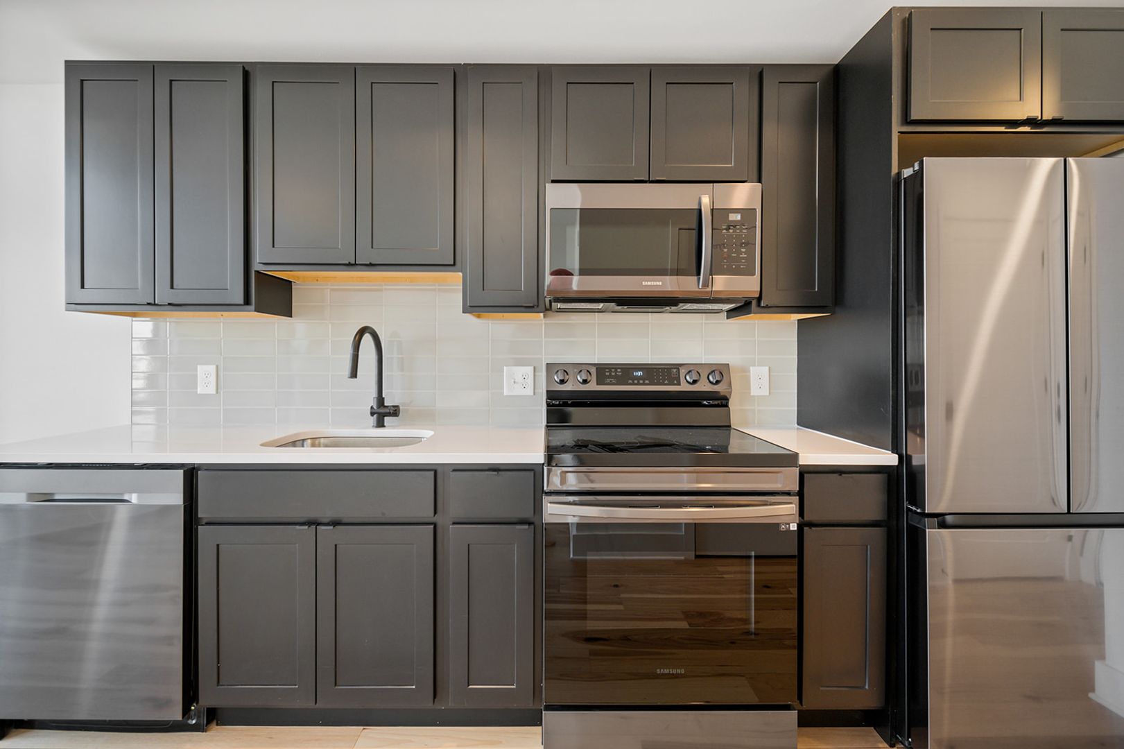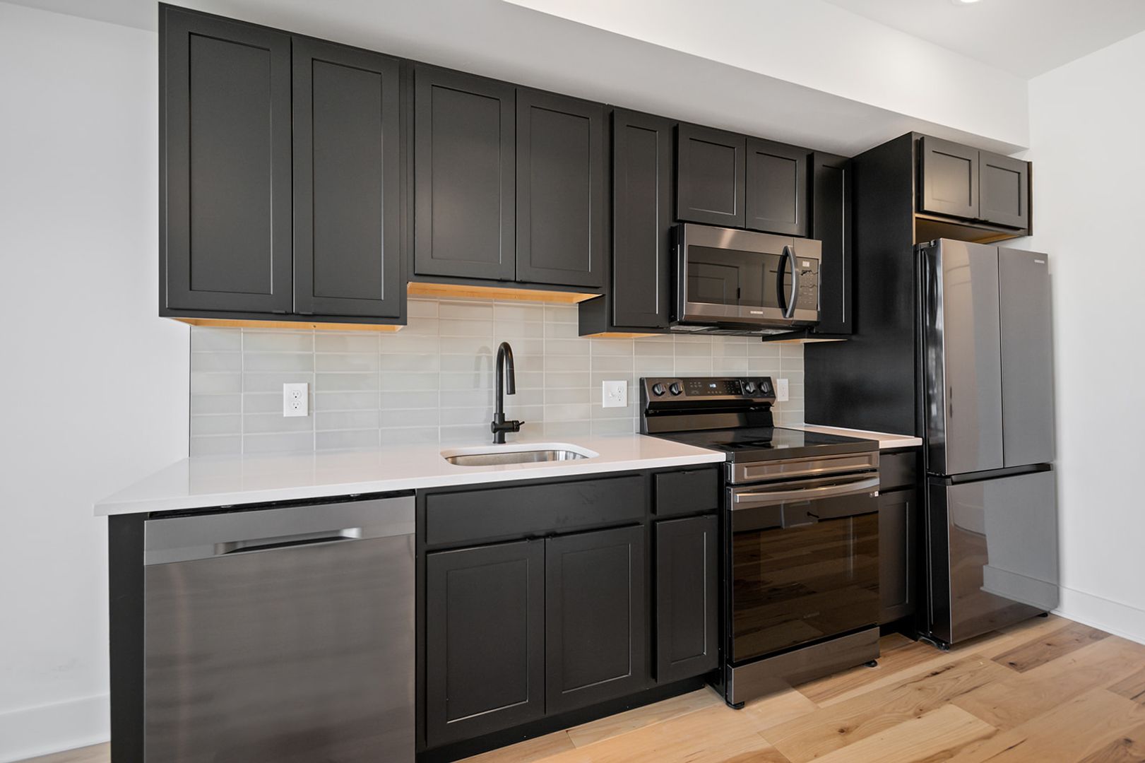 The units feature floor-to-ceiling windows that flood the space with natural light and showcase the rich hickory hardwood floors. The modern kitchens come in a range of finishes including black, navy blue, and white, with quartz countertops and fingerprint-resistant black stainless steel Samsung appliances, adding a touch of style. The in-unit stacked washer/dryers, central heating and cooling, and Energy-Star appliances make living easy and convenient.