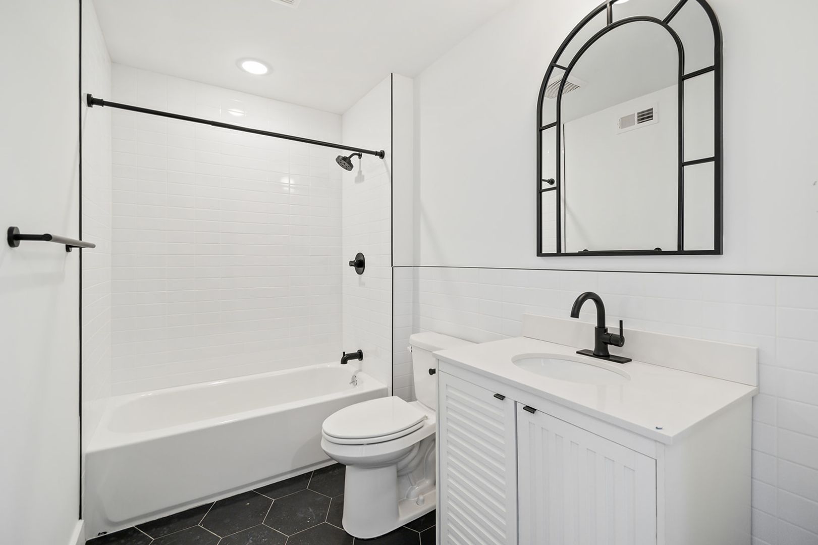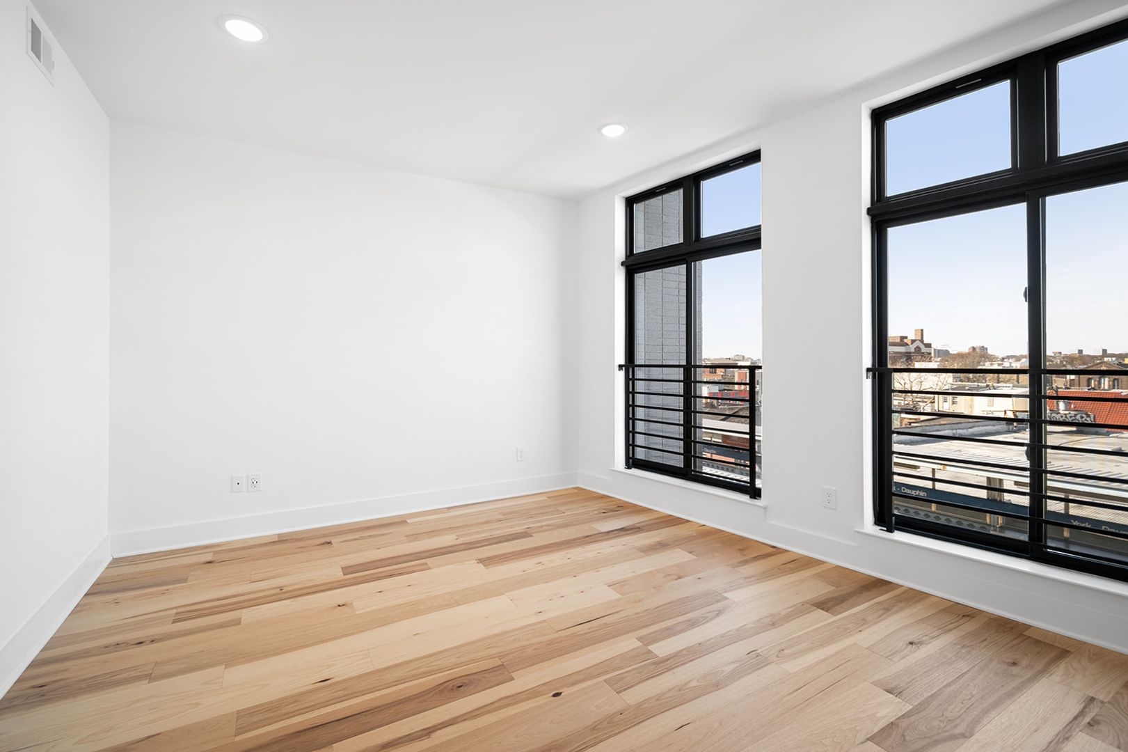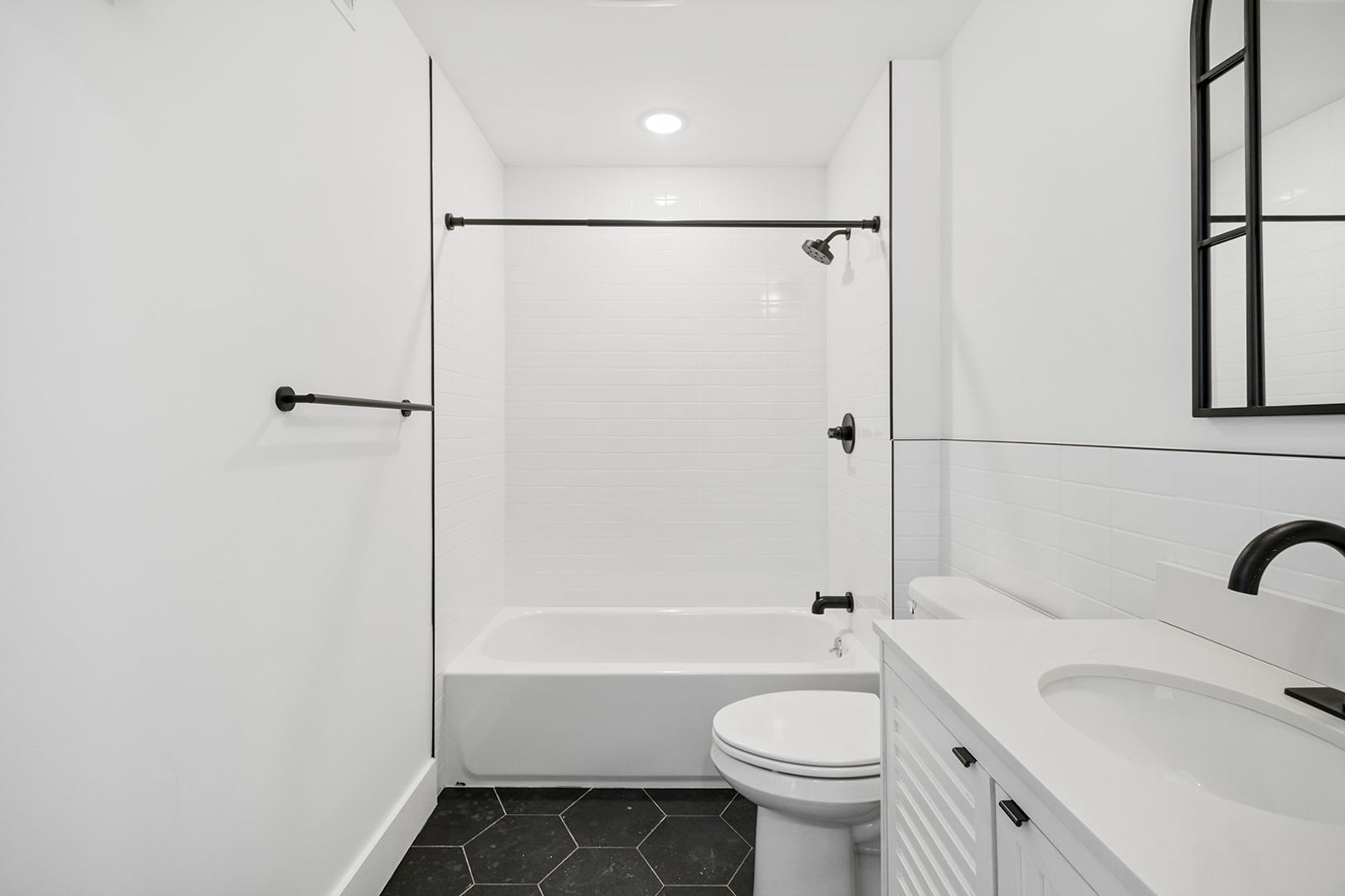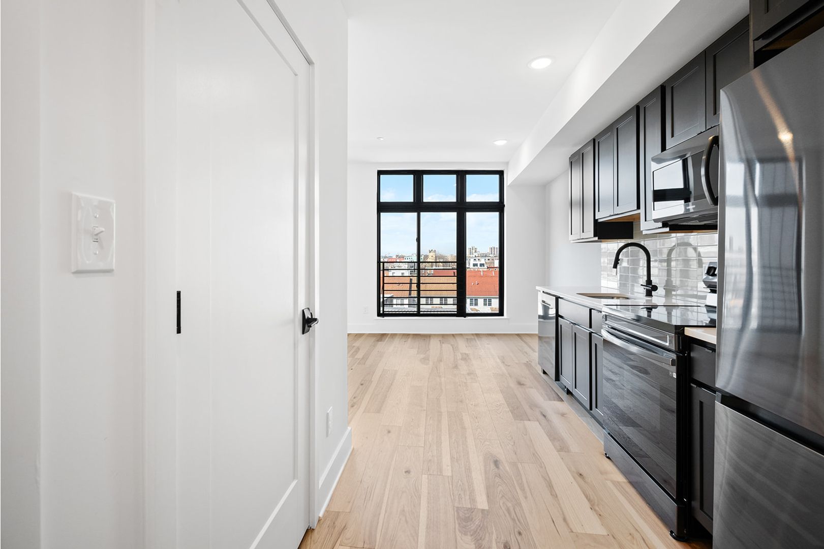 The units feature floor-to-ceiling windows that flood the space with natural light and showcase the rich hickory hardwood floors. The modern kitchens come in a range of finishes including black, navy blue, and white, with quartz countertops and fingerprint-resistant black stainless steel Samsung appliances, adding a touch of style. The in-unit stacked washer/dryers, central heating and cooling, and Energy-Star appliances make living easy and convenient.