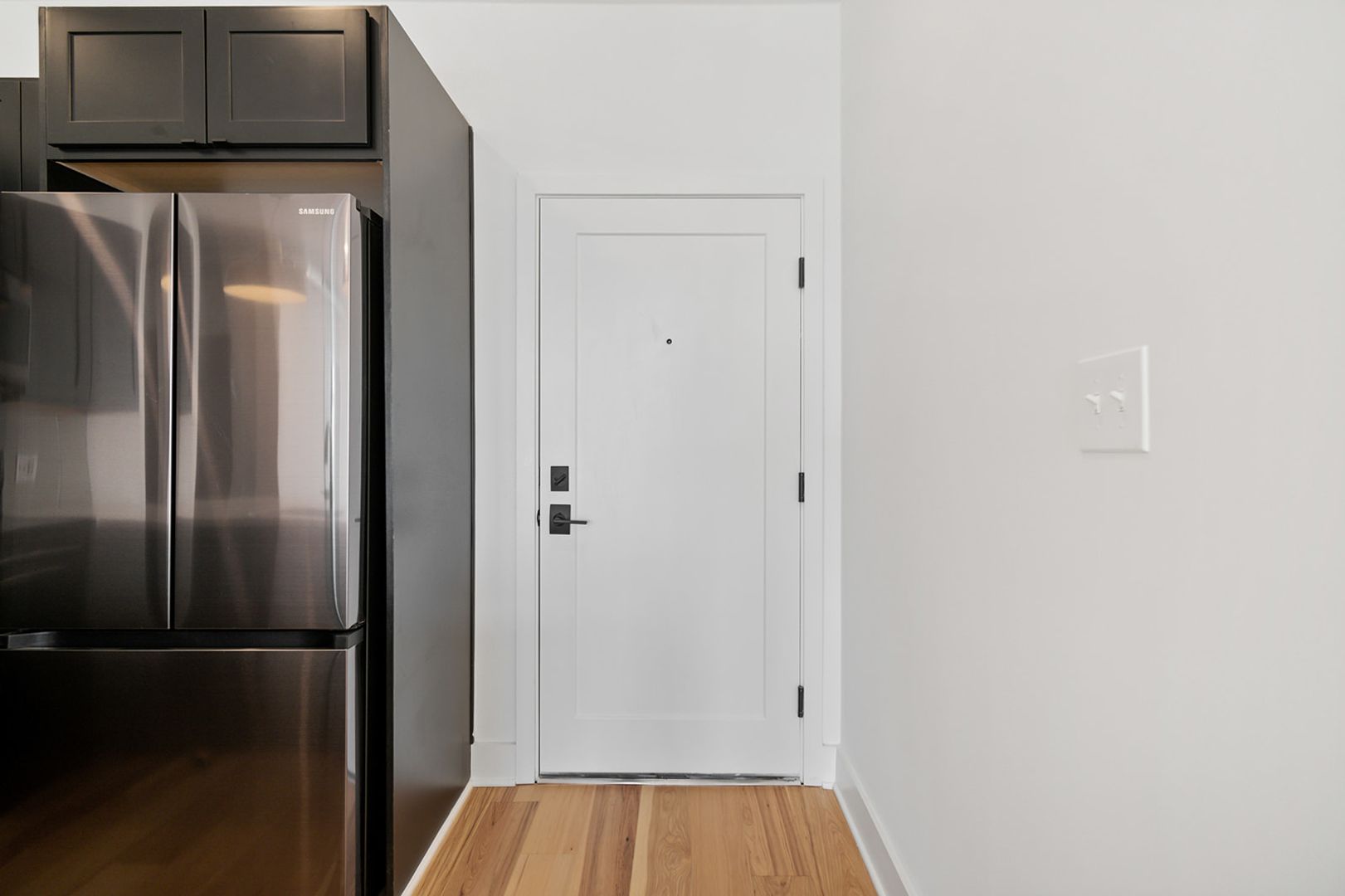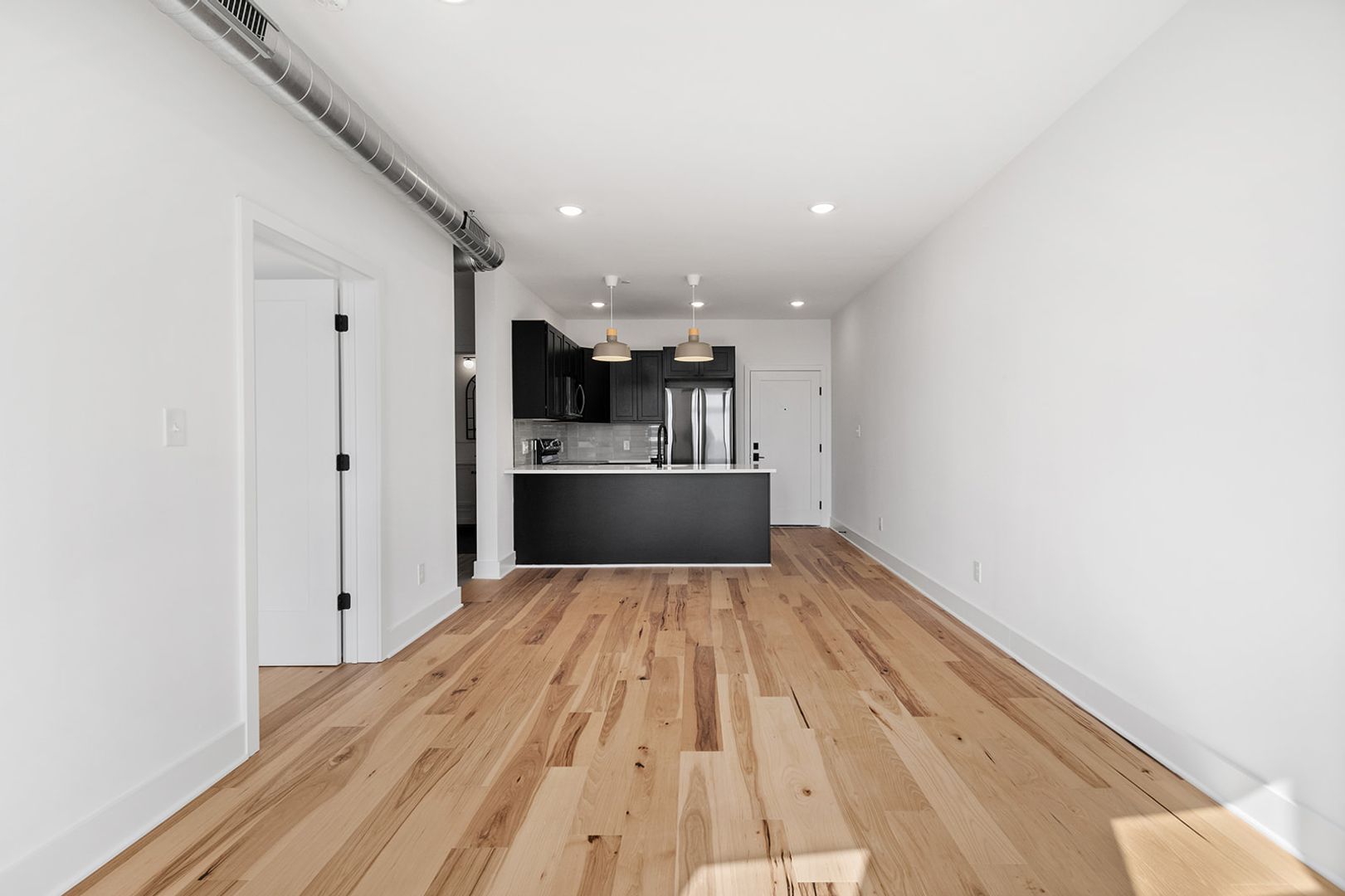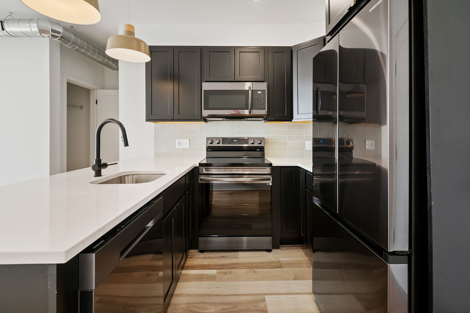 The units feature floor-to-ceiling windows that flood the space with natural light and showcase the rich hickory hardwood floors. The modern kitchens come in a range of finishes including black, navy blue, and white, with quartz countertops and fingerprint-resistant black stainless steel Samsung appliances, adding a touch of style. The in-unit stacked washer/dryers, central heating and cooling, and Energy-Star appliances make living easy and convenient.