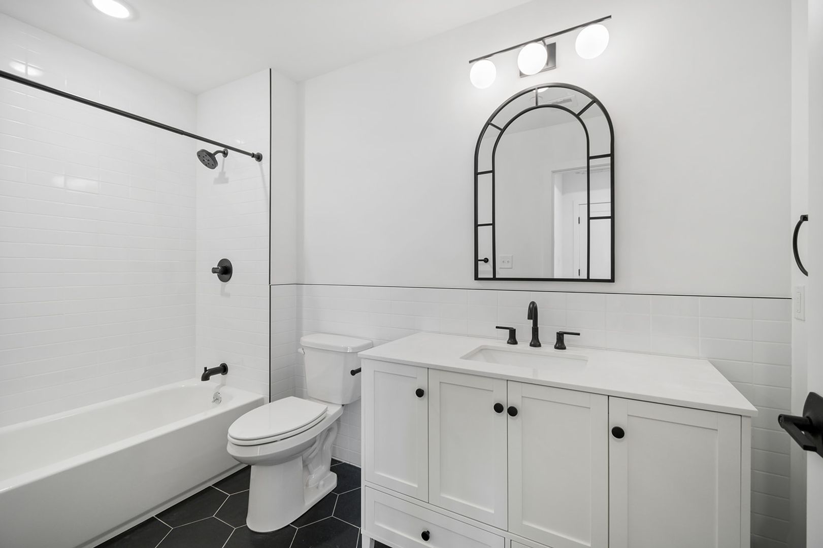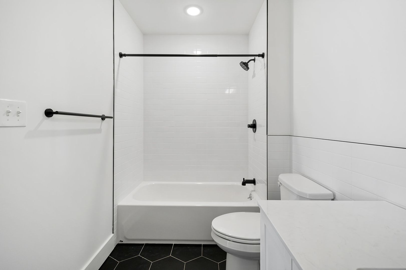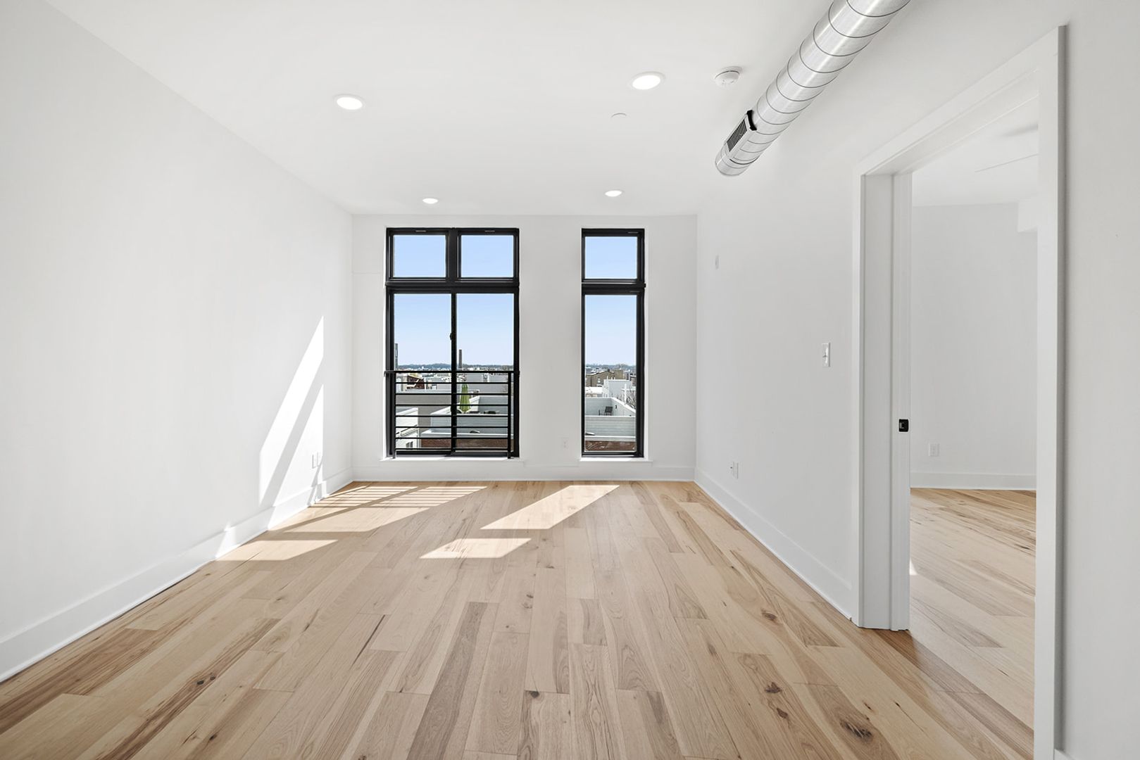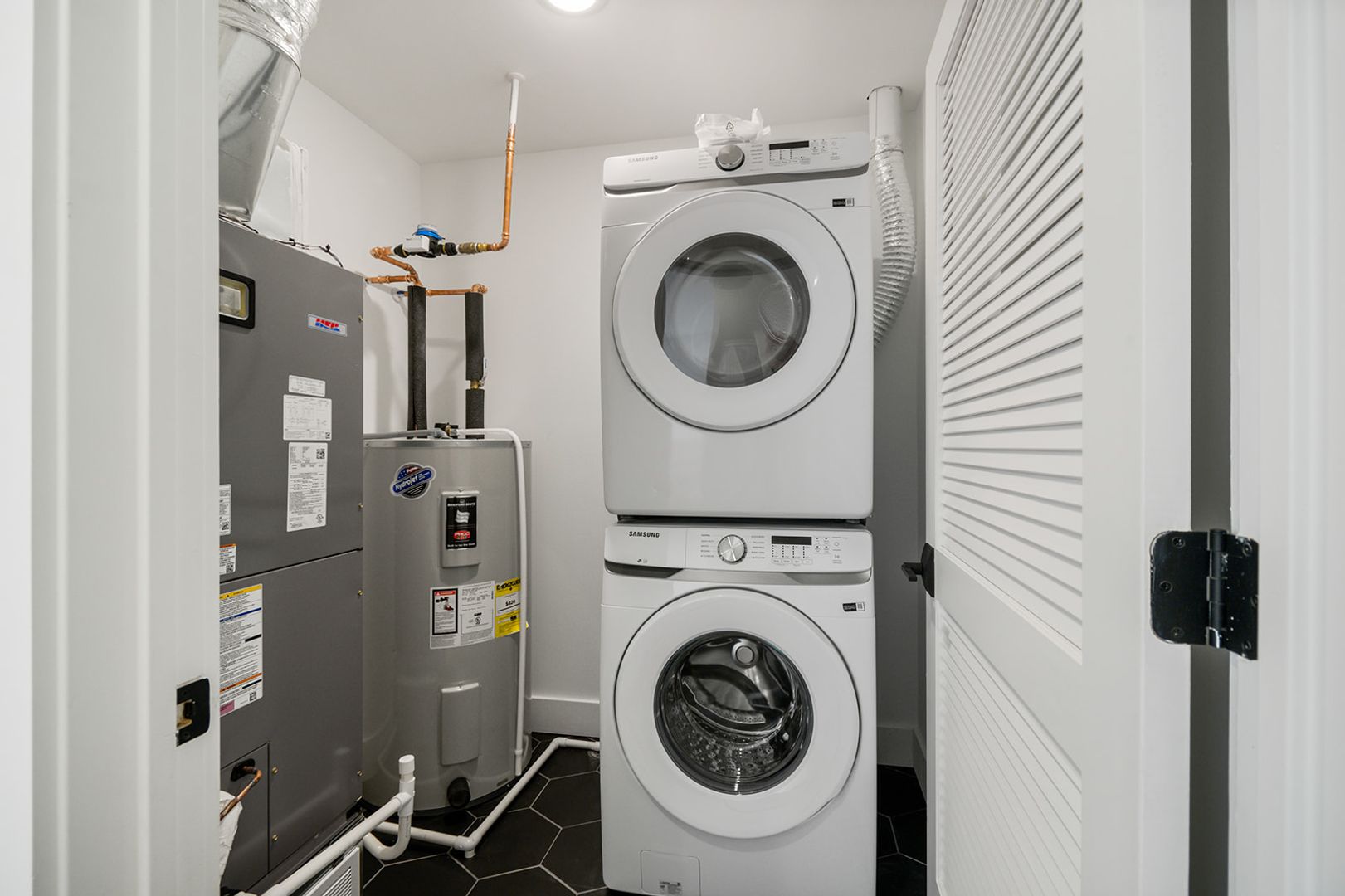 The units feature floor-to-ceiling windows that flood the space with natural light and showcase the rich hickory hardwood floors. The modern kitchens come in a range of finishes including black, navy blue, and white, with quartz countertops and fingerprint-resistant black stainless steel Samsung appliances, adding a touch of style. The in-unit stacked washer/dryers, central heating and cooling, and Energy-Star appliances make living easy and convenient.